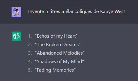 Exemple : « Donne-moi un titre d’instrumentale RnB qui parle de rupture » – « Invente 5 titres mélancoliques de Kanye West »